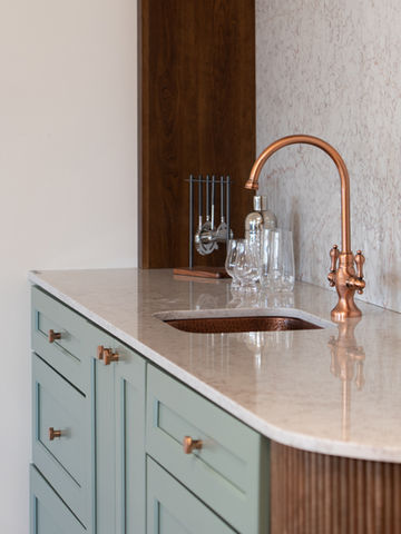 This light-filled kitchen blends natural wood tones with crisp marble countertops for a fresh, modern vibe. Earthy textures, cozy seating, and those statement green pendants make it the perfect spot to cook, gather, and unwind. It’s all about easy elegance and laid-back charm—ready for morning coffee or an impromptu dinner party. Simply inviting. Totally timeless.
